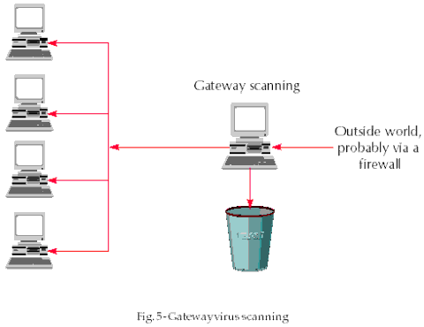 Virus-checking gateways (Fig. 5) intercept email coming into the organisation, detaching the attachments, unpacking any encoded parts and sending them to the virus scanner. Infected objects are discarded or disinfected, while uninfected ones are passed through to the recipient.